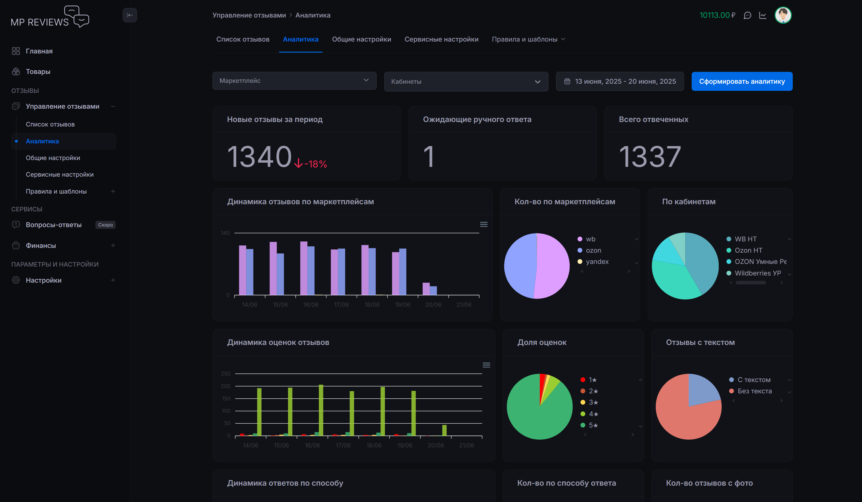 Cервис обеспечивает полную автоматизацию процесса ответов на отзывы на платформах Wildberries, Ozon и Яндекс.Маркет