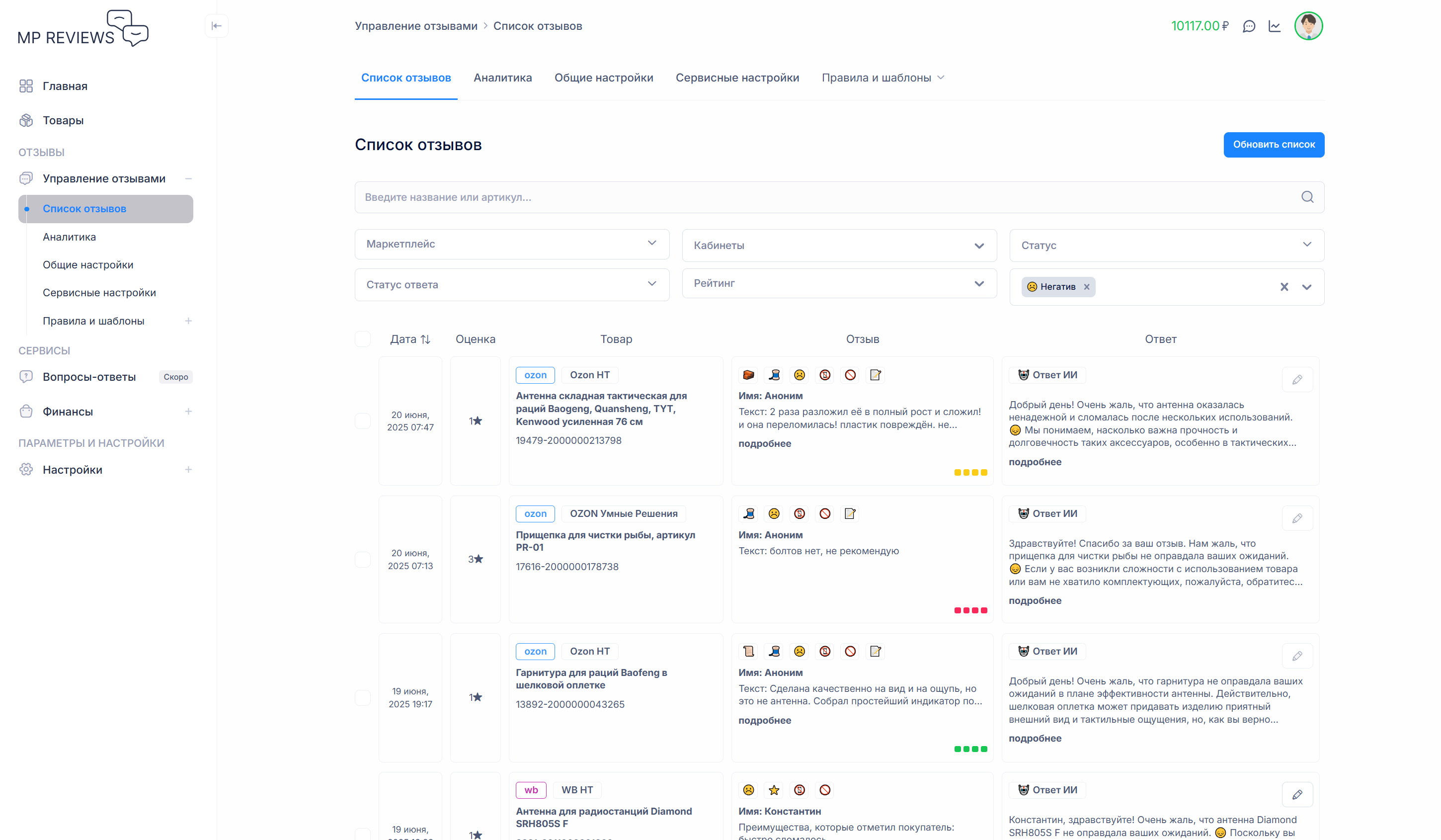 Сервис имеет единую панель управления, которая позволяет работать с отзывами на различных платформах, таких как Wildberries, Ozon и Яндекс.Маркет, без необходимости переключаться между личными кабинетами.
