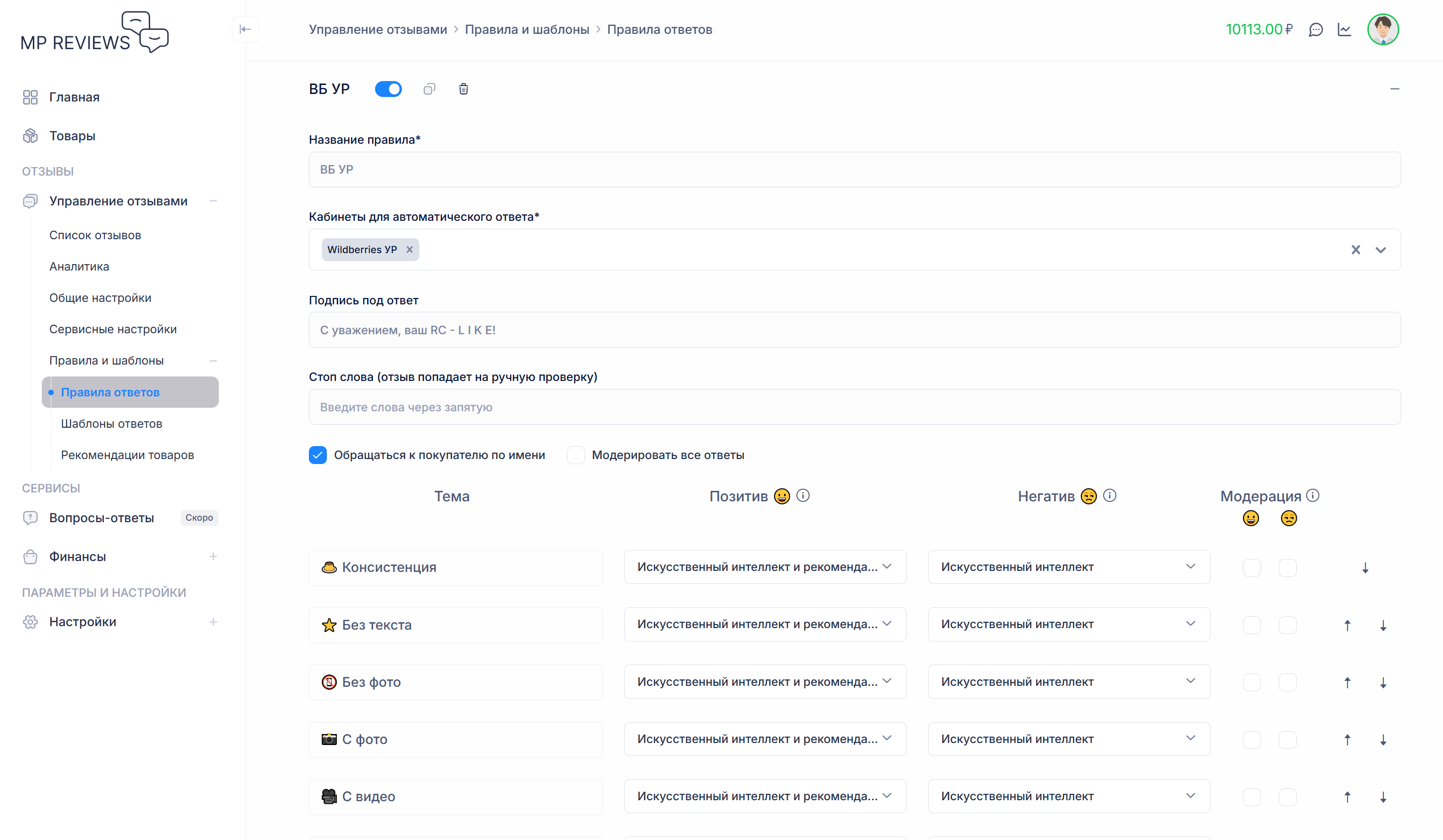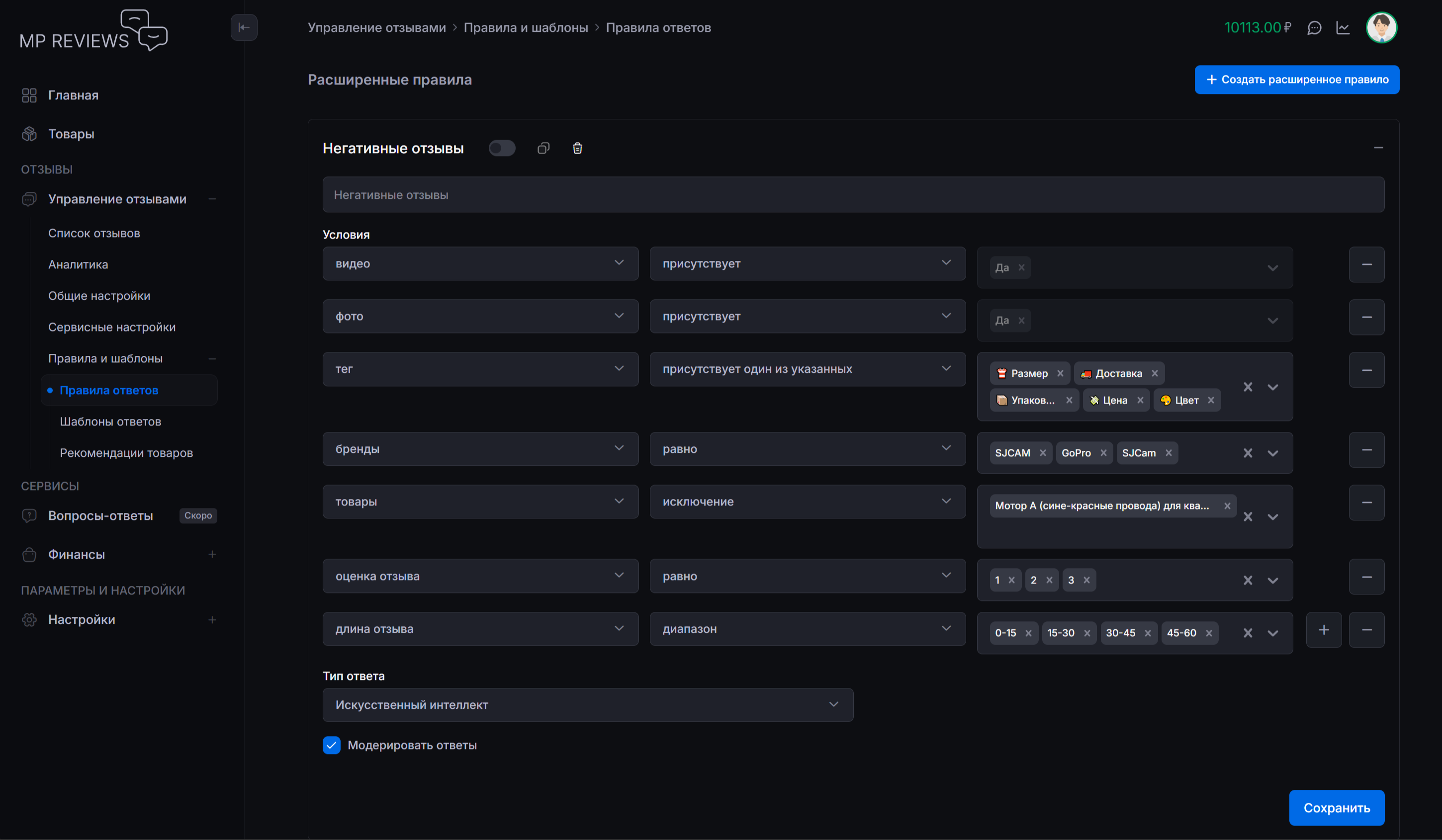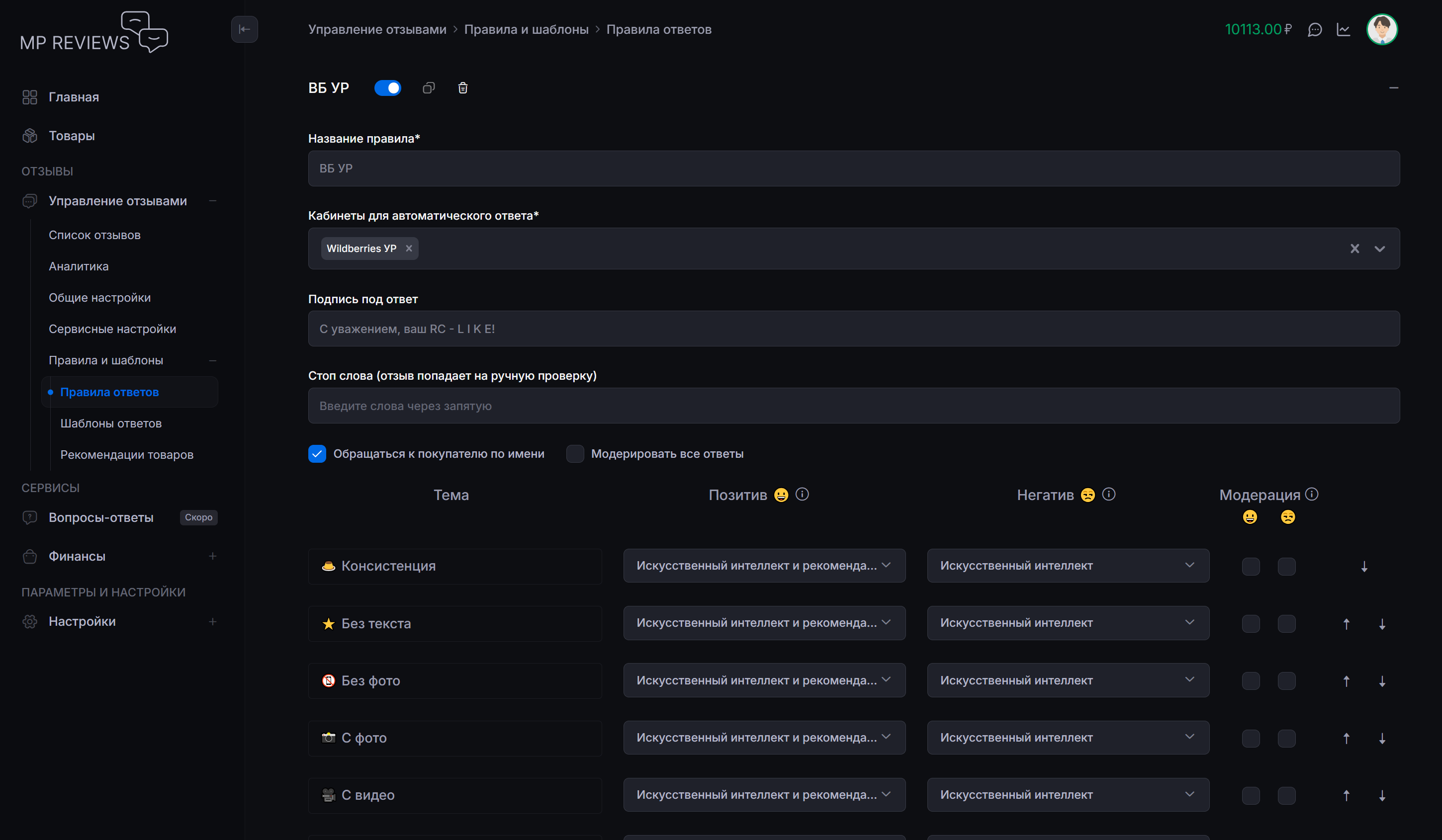 Настройте правила обработки отзывов под свои задачи и забудьте о ручных ответах!