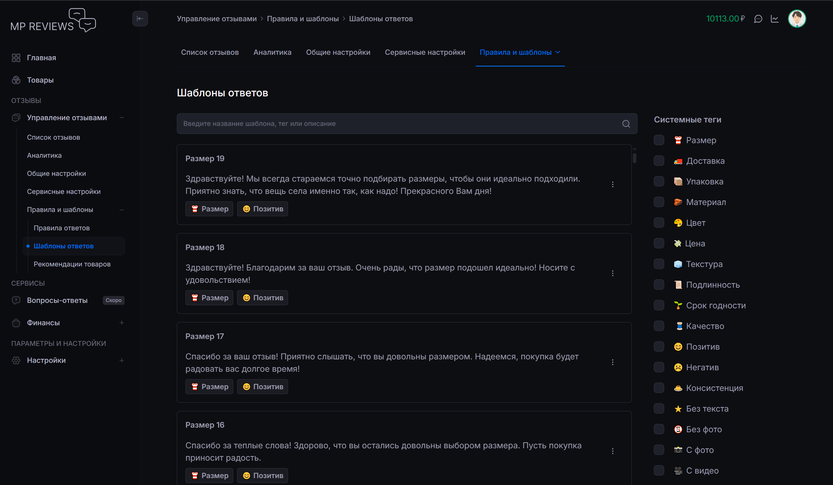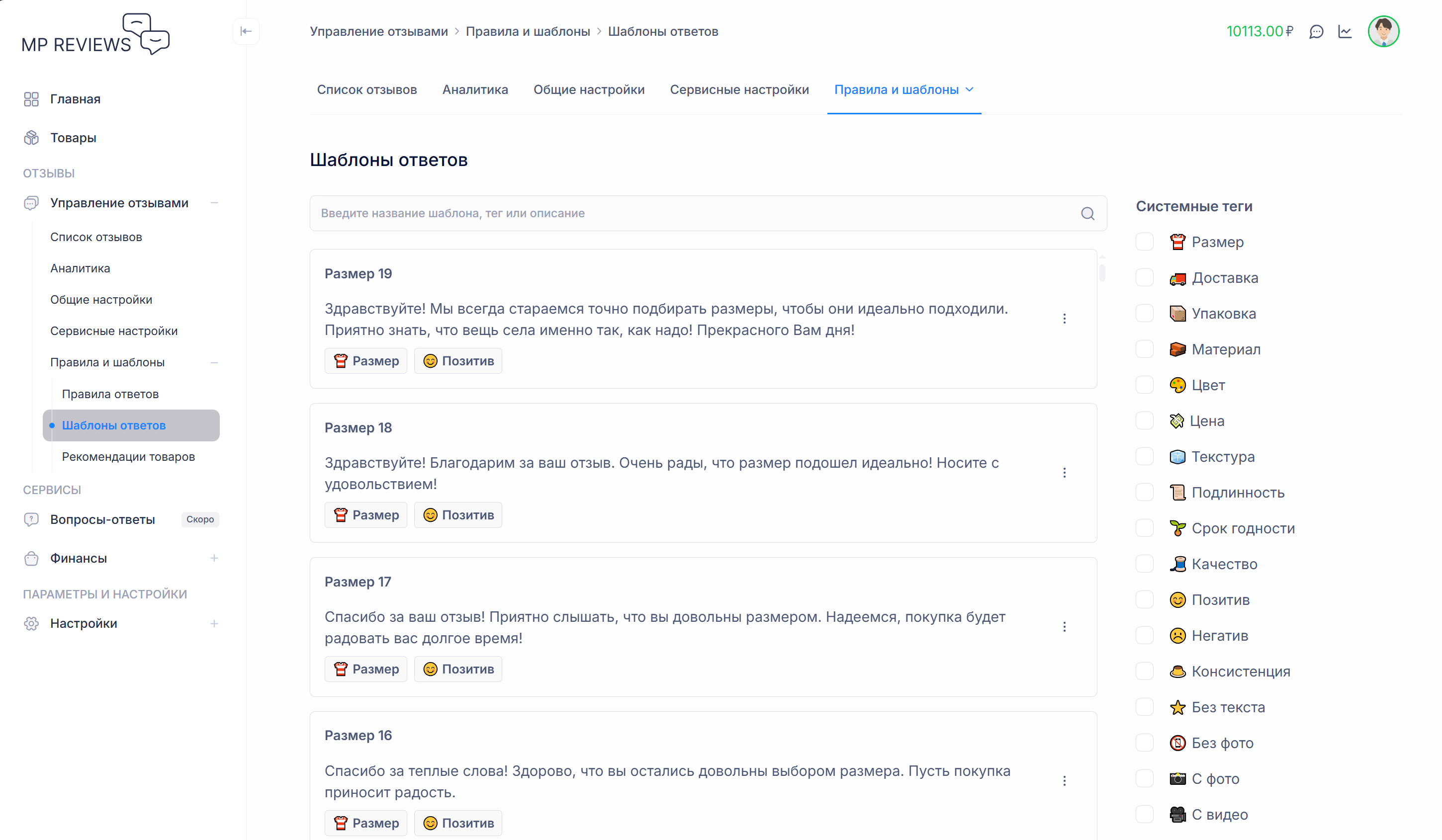 Сервис предлагает готовые шаблоны ответов для любых ситуаций: благодарность, ответы на негативные отзывы, помощь с выбором и многое другое. Шаблоны можно настраивать под стиль бренда и адаптировать под тему и тональность отзыва.